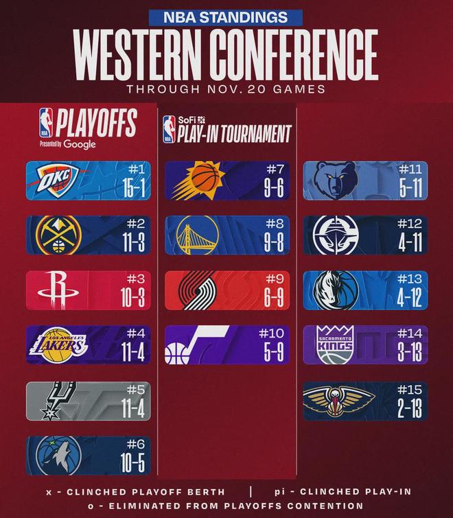 NBA积分榜又乱了!雷霆8连胜,掘金第2,火箭下滑第5,勇士3连败