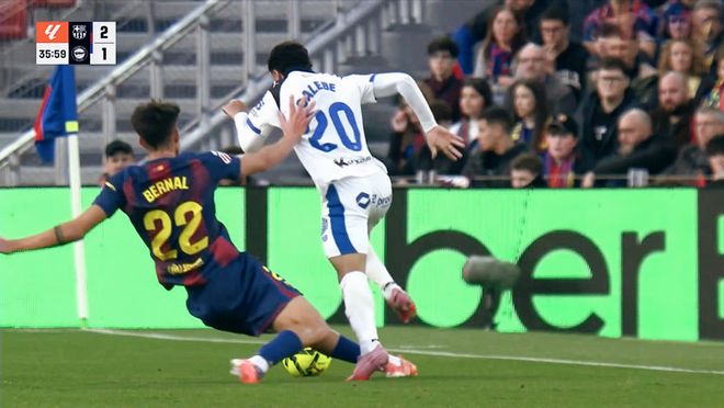 开场不到一分钟,贝尔纳尔处理球不够干脆,阿拉维斯利用角球的机会,卡萨多、贝尔纳尔连续出现失误,巴勃罗闪电破门!0:1!巴塞罗那开局遭雷击。