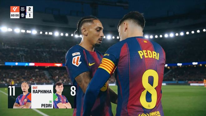 下半场回来,巴萨连换两人,拉什福德和孔德登场。巴尔德的突破,连续制造对手犯规。第57分钟,莱万禁区内的精彩头球,被对手门将奋力扑出。随后,弗里克大手一挥,将中场核心佩德里换上!全场球迷起立鼓掌。