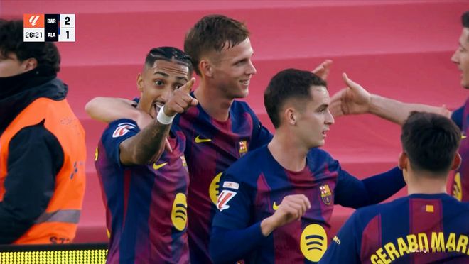 第70分钟,佩德里前场拿球不断做出精彩的表现,奥尔莫禁区推射擦着远端立柱偏出。随后亚马尔连续的尝试射门,均被对手挡出禁区。虽然巴萨始终占据场面上的优势,但是优势只有一个球,并不能保证球队绝对的胜利。博耶单刀劲射,被霍安加西亚倒地封出,阿拉维斯发起了几波强有力的反击,直到补时的最后一分钟,亚马尔助攻,奥尔莫突入禁区劲射远角破门,3:1!锁定胜局。